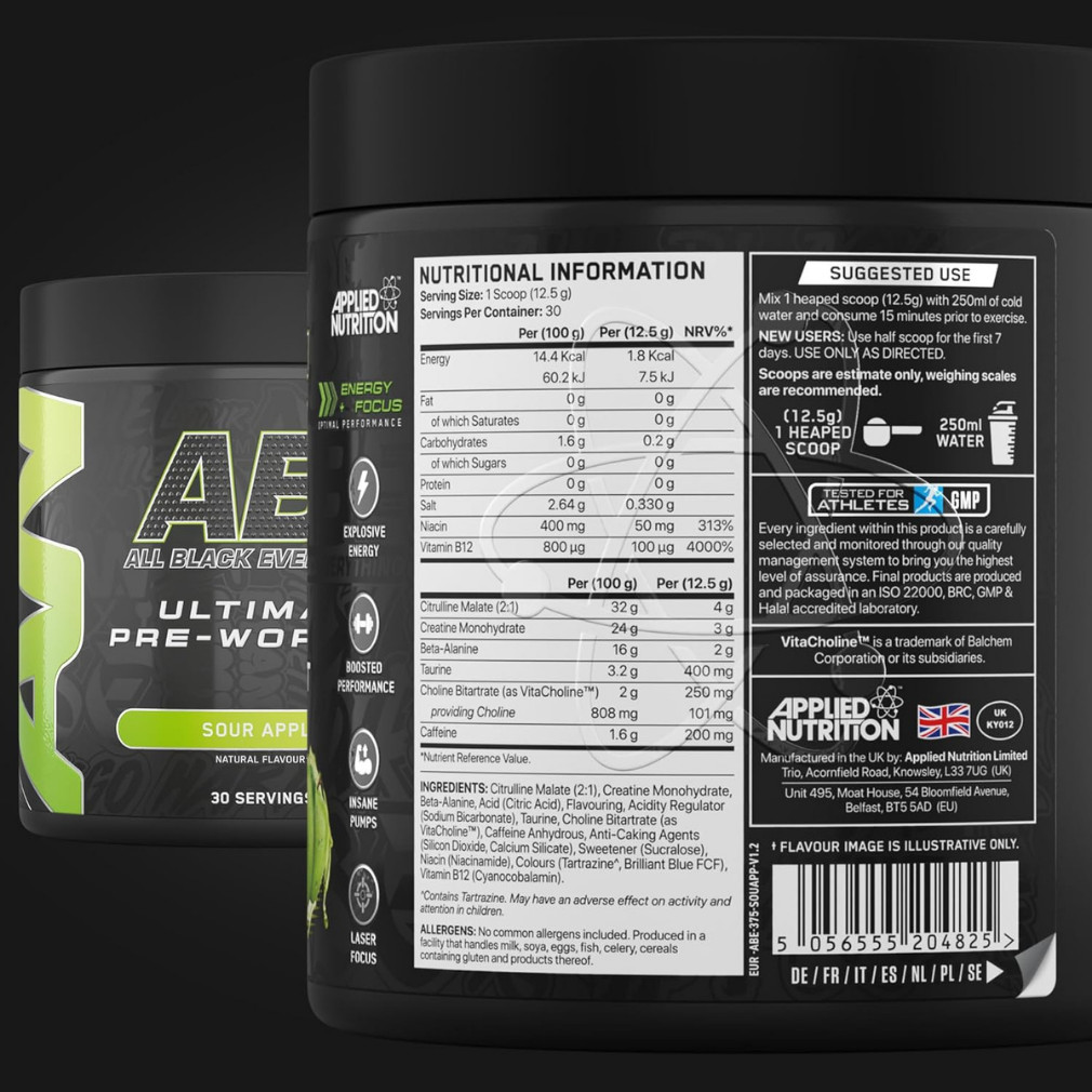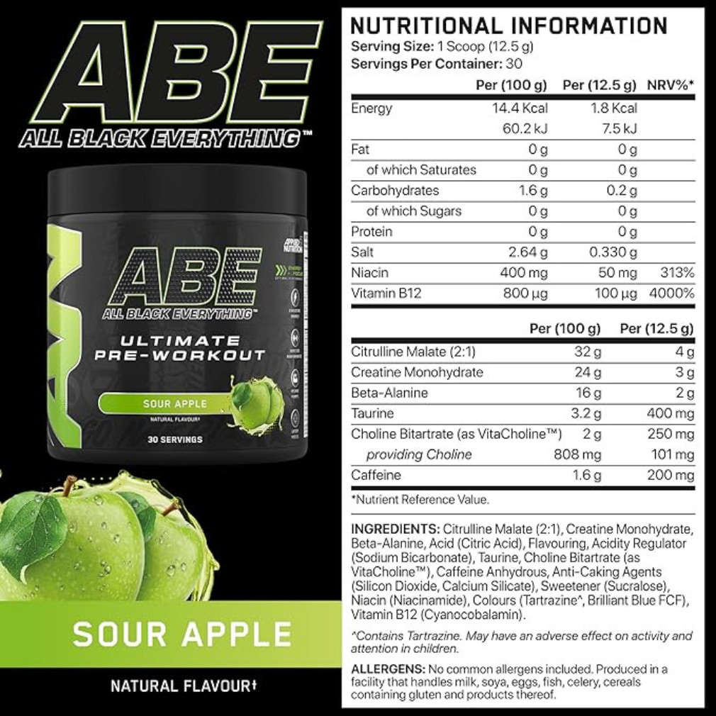 Az Applied Nutrition ABE (All Black Everything) egy erős edzés előtti italpor, amely a legjobban kutatott hatóanyagok – 4 g citrullin-malát, 3 g kreatin-monohidrát, 2 g béta-alanin, 200 mg koffein, 250 mg VitaCholine™, valamint B3- és B12-vitaminok – kombinációjával segít kihozni belőled a maximumot. Úgy lett összeállítva, hogy fokozza a fizikai teljesítményt, csökkentse a fáradtságot, javítsa a fókuszt és ütős izompumpát adjon a nagy intenzitású edzésekhez. Cukormentes, édesítőszerrel készül, több frissítő ízben, Halal minősítéssel.